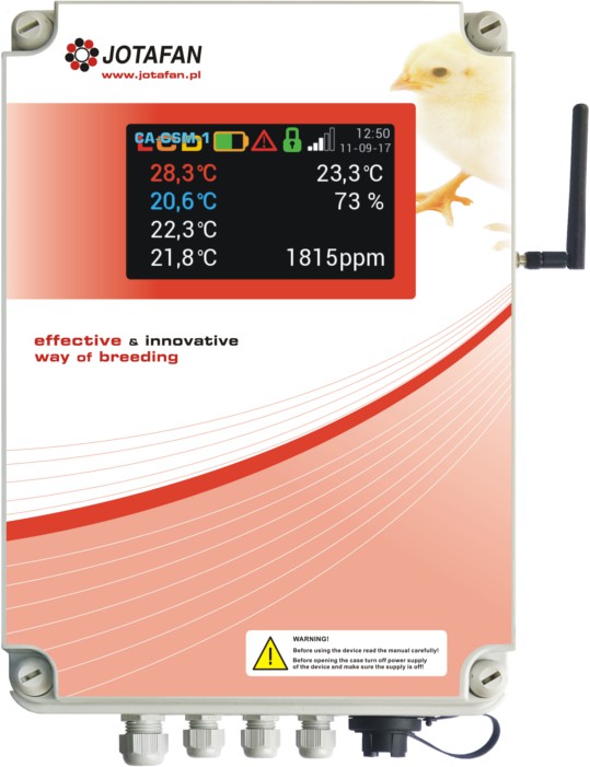 The CA-GSM-1-LCD alarming unit is designed for monitoring conditions in livestock buildings and informing the User by means of GSM communication, sending text messages (SMS) or calling (CLIP) to selected phone numbers in case of emergency situations (alarms). By means of GPRS it is possible to set remotely operation parameters of the alarming unit as well as download the history of operation. The alarming unit can also control the operation of acousto-optic signalling devices (e.g. AS510).