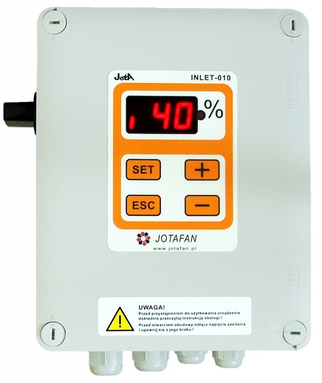 Module INLET–010–2PK-24V is an electronic controller used to control the servomotor’s work as for opening and closing the hopper-type windows supplied with 12V DC. The level of window opening can be controlled by analogue 0..10V voltage or by an RS-485 interface for cooperation with i.a. controllers of the JOTAFAN system. This device contains a manual switch that is placed outside, on the side of the housing. It is used to choose the operational mode of a servomotor: automatic, manual opening, manual closing, turning off the servo-motor’s power supply. Additionally, in the circuit of relay contacts there was installed a so called ‘quenching diode’ and RC elements for electromagnetic disturbances suppression..