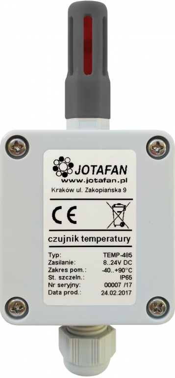 The TEMP-485 sensor is a device used to measure temperature. It is equipped with a modern, pre-calibrated digital sensor. The sensor is suitable for digital communication via RS-485 with VIRGO software version A-09. TEMP 485 can select sensor number 1 to 16, thereby allowing the attachment to the controller VIRGO up to 16 pieces of sensor for temperature measurement. On special request, it is possible to prepare the sensor TEMP-485 cooperating with the CA-GSM-1 as the fifth temperature sensor instead of RHT-01-GN.