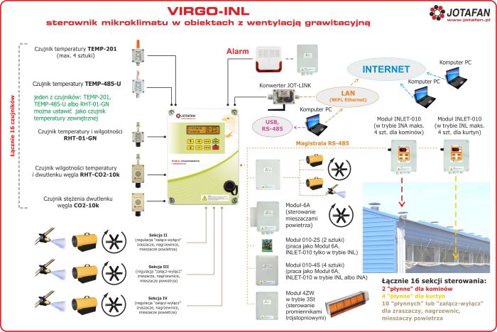 Regulator VIRGO-INL jest urządzeniem elektronicznym przeznaczonym do sterowania mikroklimatem w pomieszczeniach inwentarskich z wentylacją grawitacyjną, ogrzewaniem oraz zraszaniem (schładzaniem, nawilżaniem) na podstawie pomiaru temperatury, wilgotności i stężenia dwutlenku węgla. Regulacja mikroklimatu obydwa się poprzez sterowanie serwomotorami otwierającymi albo zamykającymi wloty powietrza (np. klapy kominowe, unoszone kurtyny boczne).