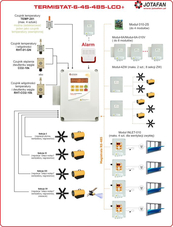 TERMISTAT-6-4S-485-LCD+ regulator mikroklimatu sterujący pracą wentylatorów oraz nagrzewnic w zależności od temperatury, a także czasu (funkcja przewietrzania). Posiada cztery wbudowane sekcje sterowania, z których każda może pracować jako wentylacyjna albo nagrzewnicowa. Pierwsza sekcja umożliwia płynną regulację obrotów wentylatorów jednofazowych albo elektrycznych promienników podczerwieni o sumarycznym prądzie nie przekraczającym 6 A. Pozostałe trzy sekcje są typu „załącz/wyłącz” i służą do bezpośredniego zasilania cewek styczników (wyjścia napięciowe).