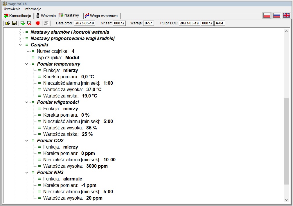 Obraz "komunikacja" pokazuje bieżące wskazania czujnika, "nastawy" ilustruje zadane progi alarmowe.