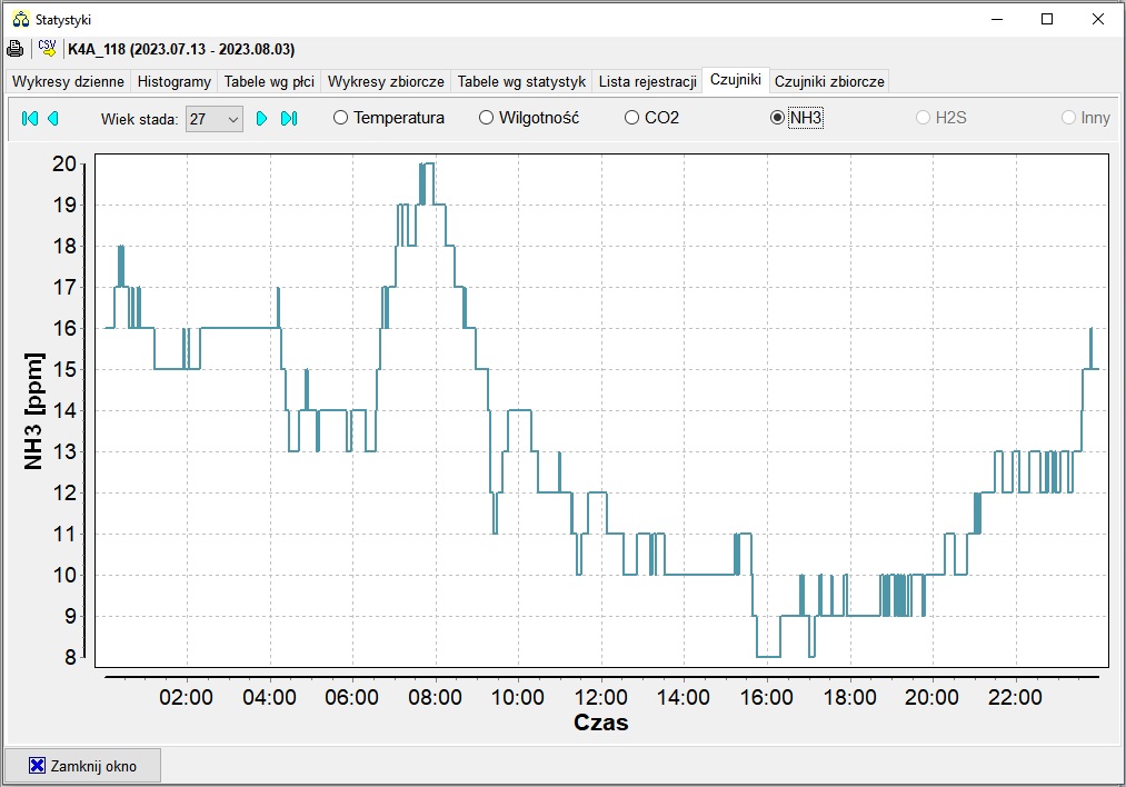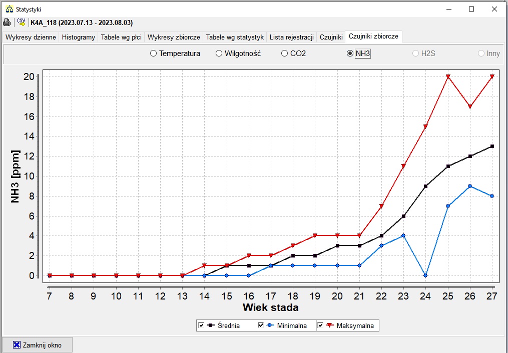 W pozostałych dwóch plikach "statystyka..." są pokazane rejestracje stężenia amoniaku: w ciągu doby oraz wartości stężenia w każdej dobie: średnią (linia czarna), minimalną (niebieska) i maksymalną (czerwona).