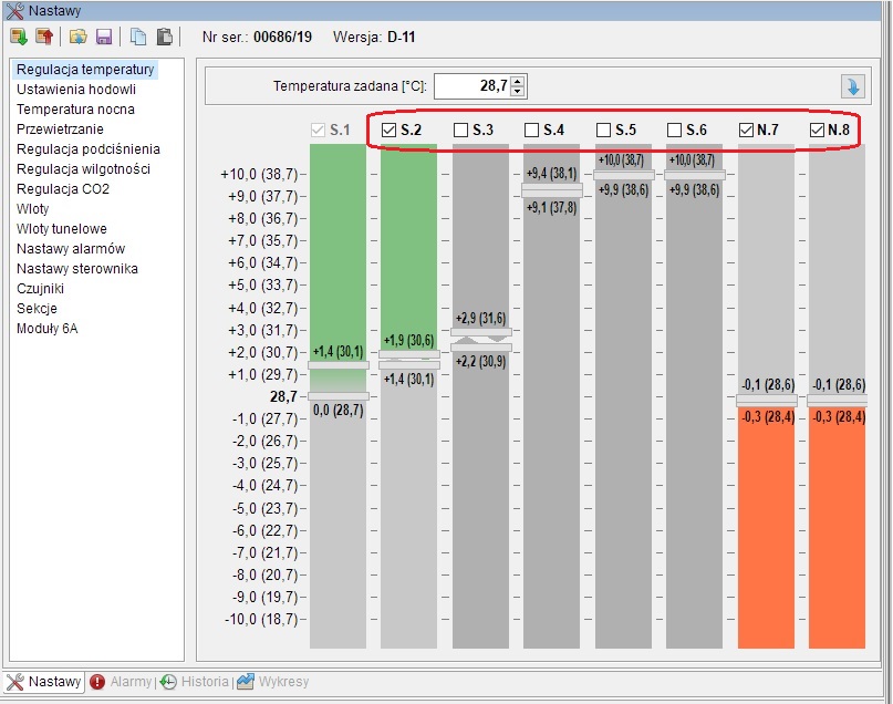 W programie FERMA -VIRGO wprowadzono opcję intuicyjnego wyłączania sekcji, które nie są potrzebne w bieżącym procesie chowu (np. sekcje wentylatorów sczytowych zimą). Pozwala to na zoptymalizowanie pracy systemu. Załączenie i wyłączenie sekcji odbywa się bezpośrednio w menu "Regulacja temperatury", "Regulacja wilgotności" oraz "Regulacja CO2" przełącznikiem nad nastawą danej sekcji (kwadracik z "ptaszkiem"). Sekcja wyłączona jest pokazana w kolorze szarym. Podobnie jak przy zmianie innych nastaw - trzeba je wysłać do sterownika.