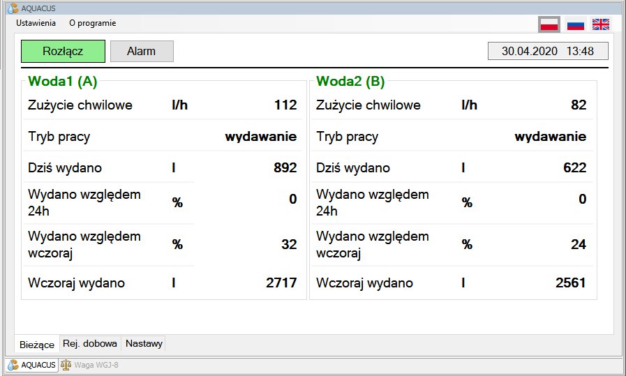 Za pośrednictwem modułu oprogramowania AQUACUS można obserwować na bieżąco dobowy wydatek wody, chwilowy przepływ oraz statystykę porównawczą dnia bieżącego w stosunku do poprzedniego (Zakładka "Bieżące").