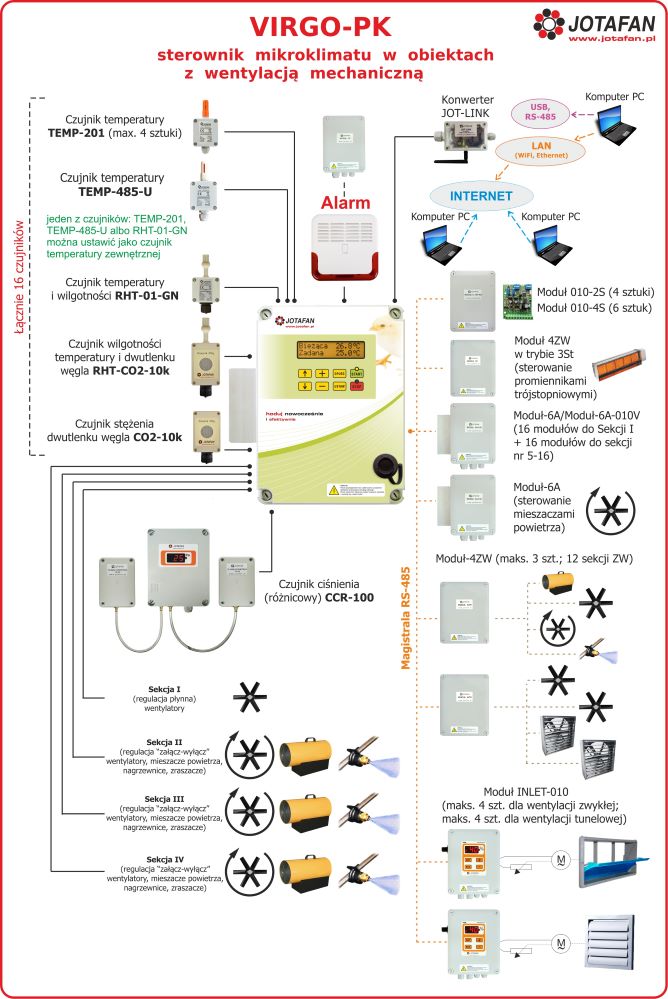 Wbudowany interfejs komunikacyjny RS-485 daje możliwość połączenia wielu sterowników VIRGO-PK w sieć i zarządzanie ich pracą za pomocą komputera PC - można również skonfigurować system do zdalnego nadzoru - poprzez internet.