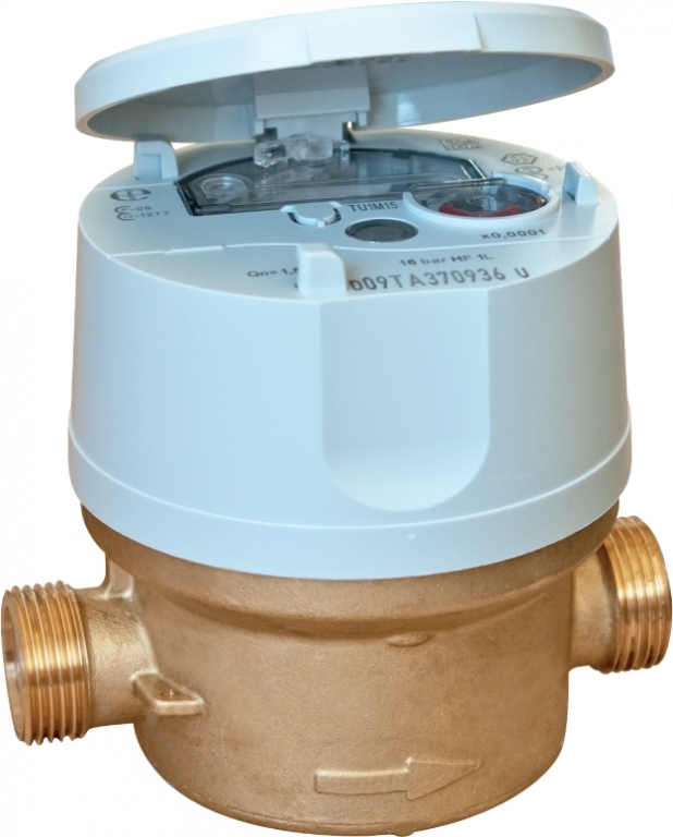 Wodomierz AQUADIS - jednostrumieniowy, mechaniczny miernik przepływu wody (liczydło w litrach) z możliwością wyposażenia w elektroniczny moduł impulsowy CYBLE o stałej 1 impuls/1 litr. W komplecie układ blokady przepływu wstecznego i nakrętki redukcyjne 3/4" > 1/2".