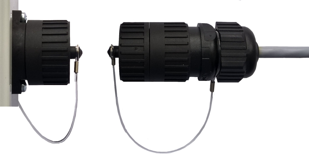 Stopień szczelności złącz: IP-67. Dostępne są wtyki hermetyczne typu "męski" 3+PE-M i "żeński" 3+PE-F dzięki czemu możliwe jest wykonywanie rozłącznych połączeń kablowych, np. zasilania i sterowania pracą nagrzewnicy, czy mieszacza powietrza bez potrzeby ingerowania w obudowę tych urządzeń (łącze „na kablu”).